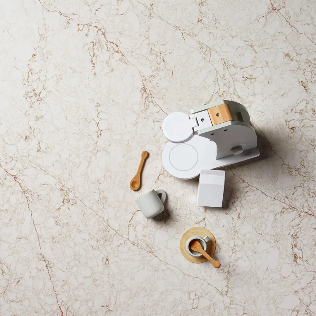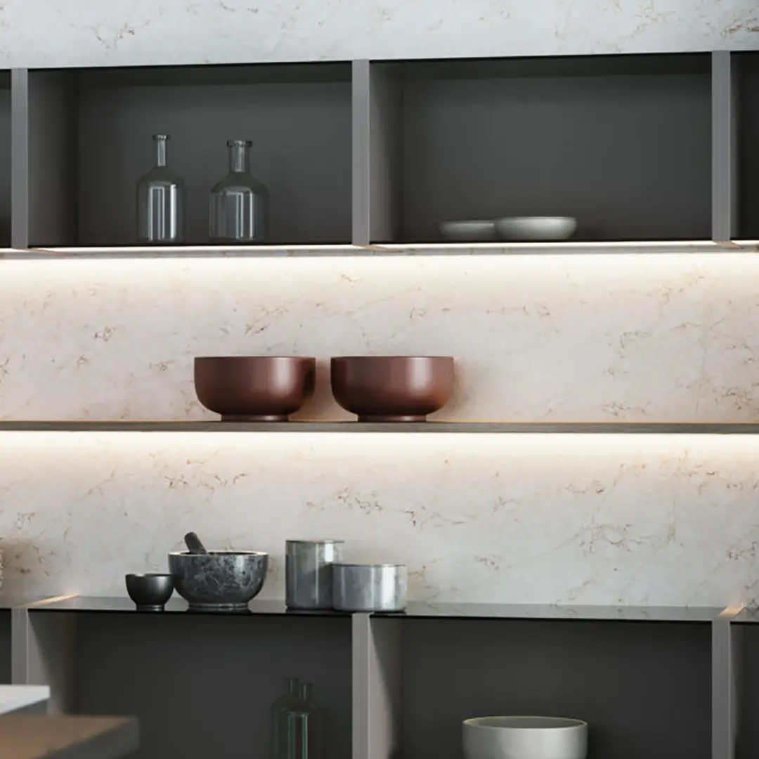Bianco Luxe viene en terminación Pulido. Es un acabado muy suave, liso y sedoso. Con un brillo discreto que realza el material, reflejando muy bien la luz y destacando las vetas y los diseños de los distintos modelos.