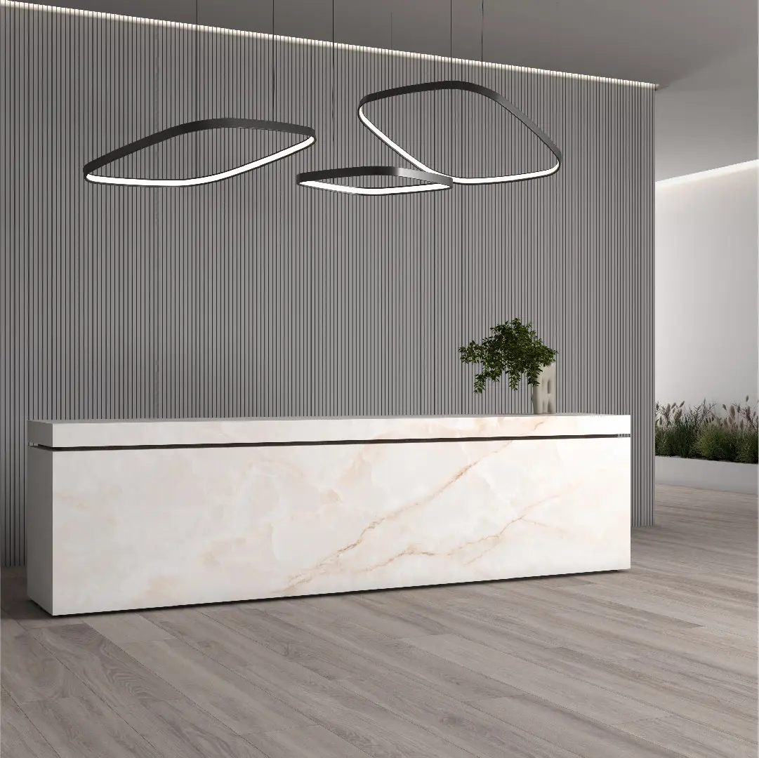 El delicado veteado y el esplendor de Onyx la convierten en la perfecta opción para espacios de lujo y sofisticación. Una pieza translucida con distintos puntos de luz que resaltan su color.
